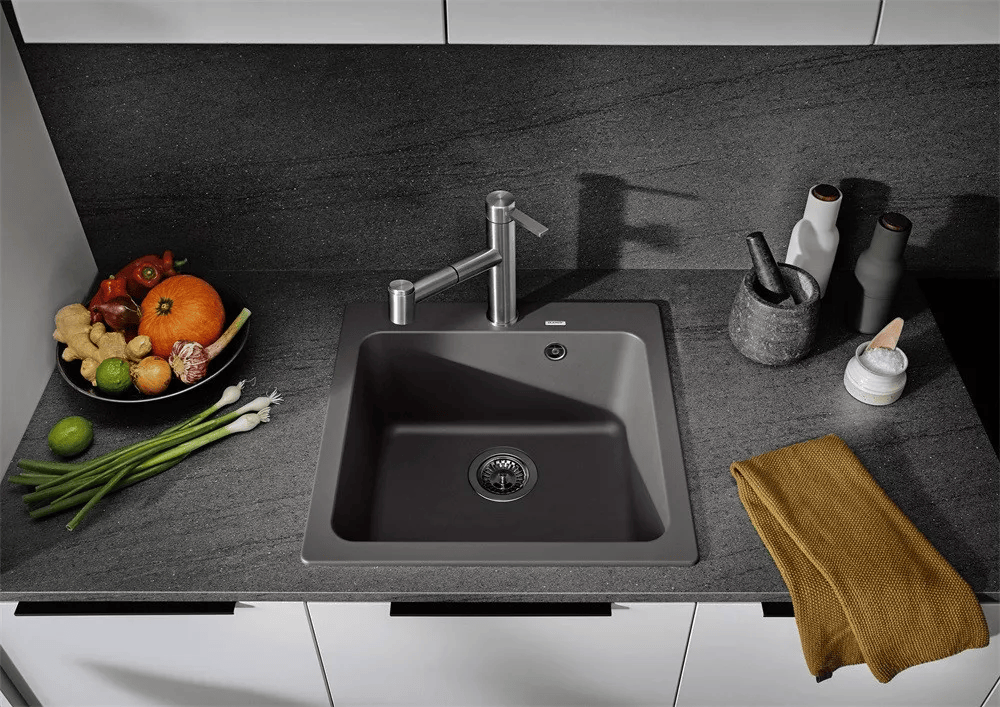 A mosogató anyaga Silgranit PuraDur®, amely 80%-ban természetes gránitőrleményből áll. Ez az összetétel kiválóan ellenáll a karcolásnak, hőhatásnak (akár 280 °C-ig), savaknak és háztartási vegyszereknek. A zárt pórusú felület higiénikus, könnyen tisztítható, nem színeződik el, és hosszú távon is megőrzi eredeti színét és textúráját.
